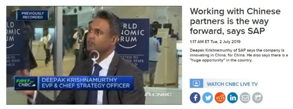 At the Summer Davos Forum held in Dalian, China, Deepak Krishnamurthy, executive vice president of SAP, said: "We believe in this cooperation model."