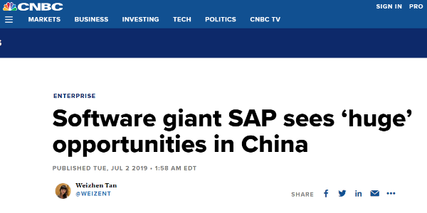 According to the CNBC website of the United States reported on July 2nd, the German software giant SAP believes that the China market has a "huge" opportunity and will seek to expand in China. Headquartered in waldorf, SAP occupies an important position in the enterprise resource management (ERP) software market and is one of the largest enterprise application software providers in the world.